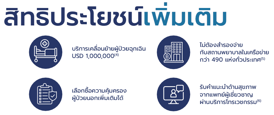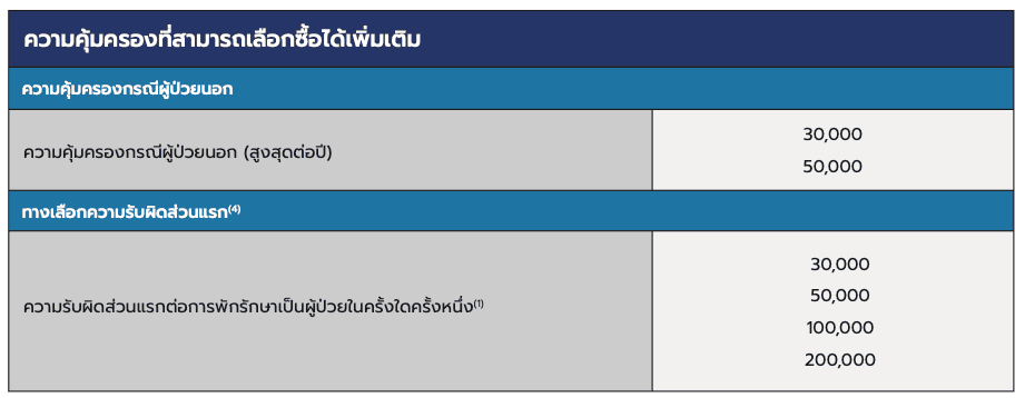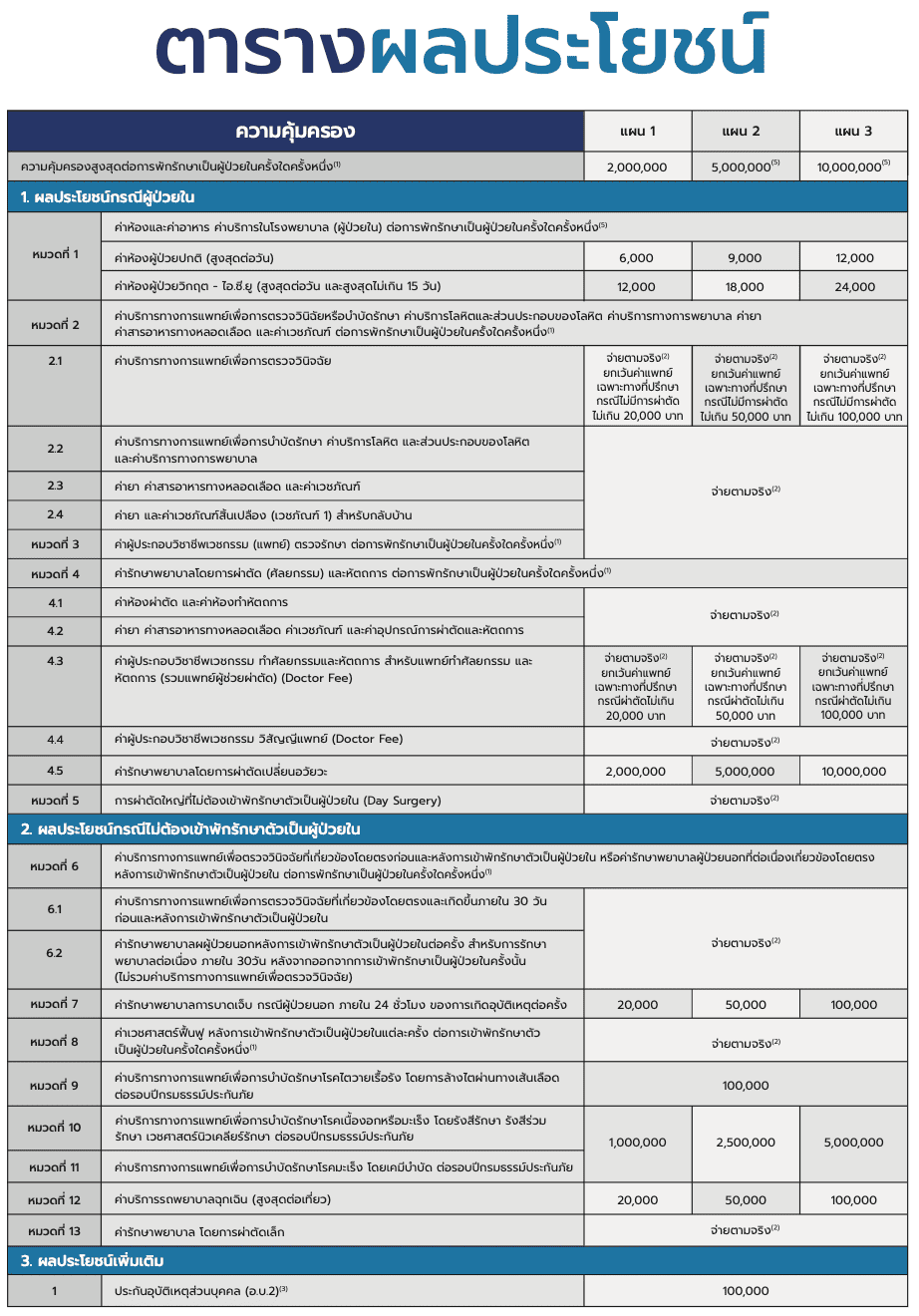 – ผลประโยชน์ค่ารักษาพยาบาลสูงสุดต่อรอบปีกรมธรรม์ (ข้อ 1 ผลประโยชน์กรณีผู้ป่วยใน และข้อ 2 ผลประโยชน์กรณีไม่ต้องเข้าพักรักษาตัวเป็นผู้ป่วยใน) : 30 ล้านบาท