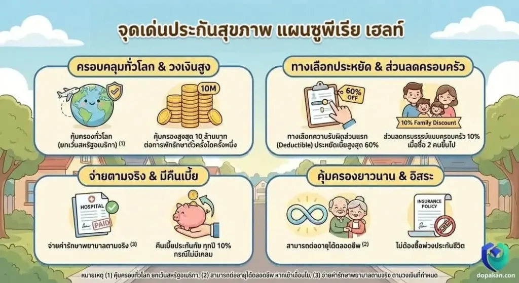 นี่เลยแผนการประกันที่คุ้มครองค่ารักษาพยาบาลแบบเหมาจ่ายสูงสุด 10 ล้านบาทต่อการพักรักษาเป็นผู้ป่วยในครั้งใดครั้งหนึ่ง สามารถต่ออายุได้ตลอดชีพ ค่ารักษาจ่ายตามจริง ไม่ต้องซื้อพ่วงประกันชีวิต ทำกรมธรรม์แบบครอบครัวตั้งแต่สองคนขึ้นไปรับส่วนลด 10% พร้อมเงินคืนทุกปี 10% กรณีกรณีไม่มีการเคลม เบี้ยประกันเริ่มต้นเพียง 76 บาท/วัน(เพศชาย อายุ 35 ปี)