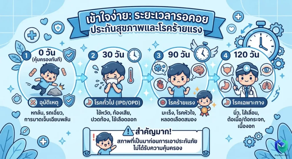 * การป่วยดังต่อไปนี้ที่เกิดขึ้นในระยะเวลา 120 วันนับแต่วันที่ความคุ้มครองเริ่มมีผลบังคับ ได้แก่ เนื้องอก ถุงน้ำ หรือมะเร็งทุกชนิด, ริดสีดวงทวาร, ไส้เลื่อนทุกชนิด, ต้อเนื้อ หรือต้อกระจก, การตัดทอนซิล หรืออดีนอยด์, นิ่วทุกชนิด, เส้นเลือดขอดที่ขา และเยื่อบุโพรงมดลูก เจริญผิดที่