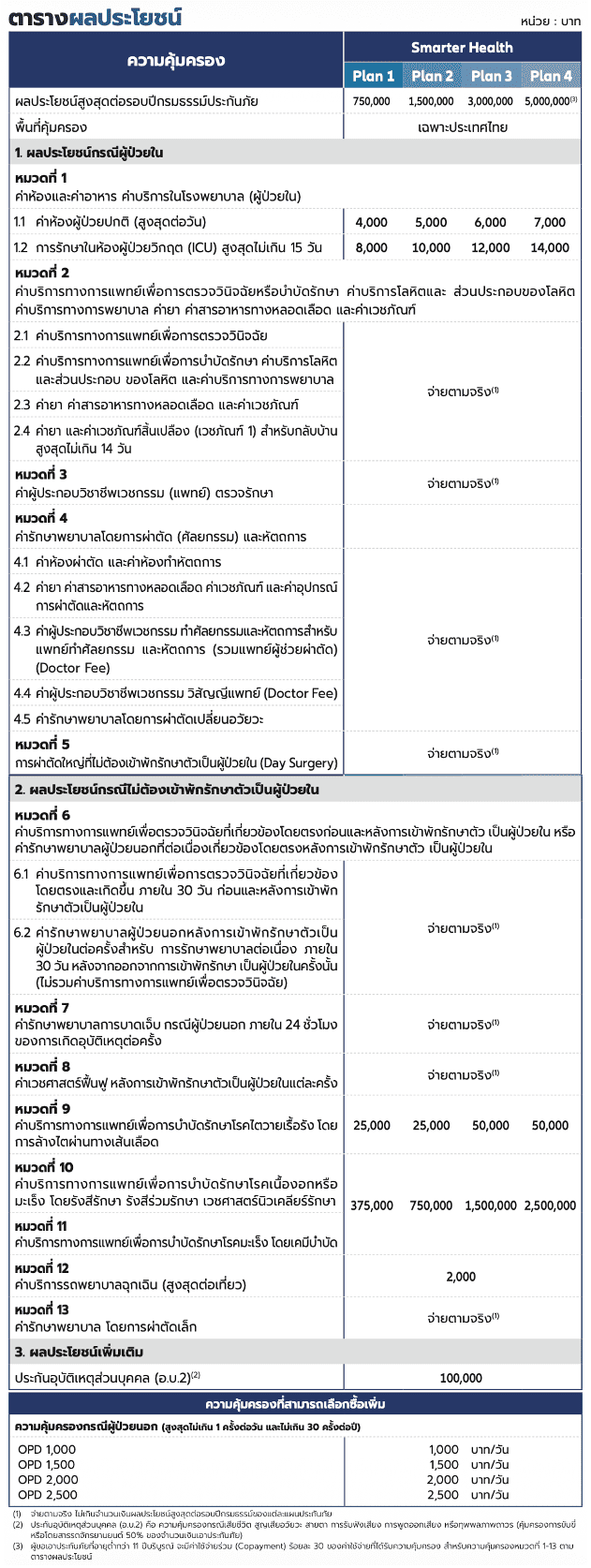 (1)ผลประโยชน์ที่แสดงข้างต้นเป็นตัวอย่างของแผนสูงสุด โดยความคุ้มครองไม่เกินวงเงินสูงสุดของแต่ละแผนประกันภัย และเงื่อนไขเป็นไปตามกรมธรรม์ประกันภัยกำหนด