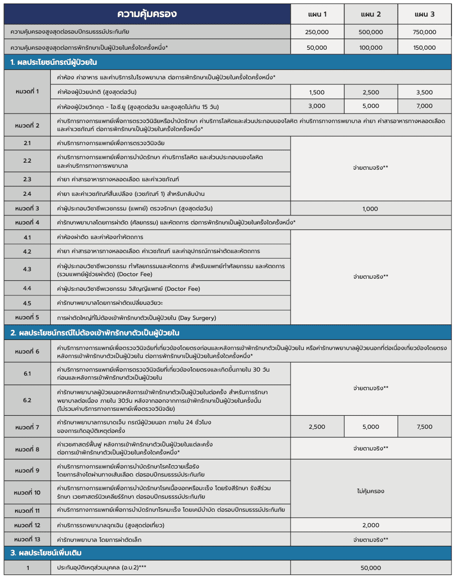 หมายเหตุ แผนประกันภัยนี้ให้ความคุ้มครองการรักษาพยาบาลที่เกิดขึ้นในประเทศไทยเท่านั้น