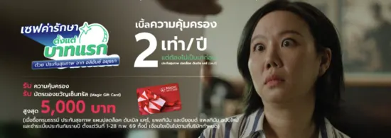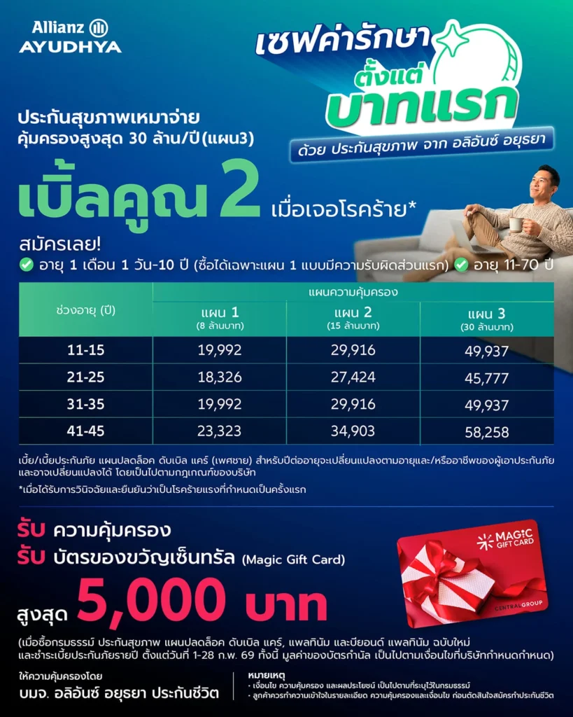 พิเศษ! รับบัตรของขวัญเซ็นทรัล (Magic Gift Card) สูงสุดมูลค่า 5,000 บาท เมื่อซื้อกรมธรรม์ ประกันสุขภาพ แผนปลดล็อค ดับเบิล แคร์, แพลทินัม และบียอนด์ แพลทินัม ฉบับใหม่ และชำระเบี้ยประกันภัยรายปี ตั้งแต่วันที่ 1 – 28 กุมภาพันธ์ 2569